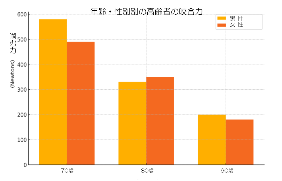 平均的な咬合力:健康な高齢者でも、若年成人に比べて咬合力は低くなります。平均的な咬合力は約100~
